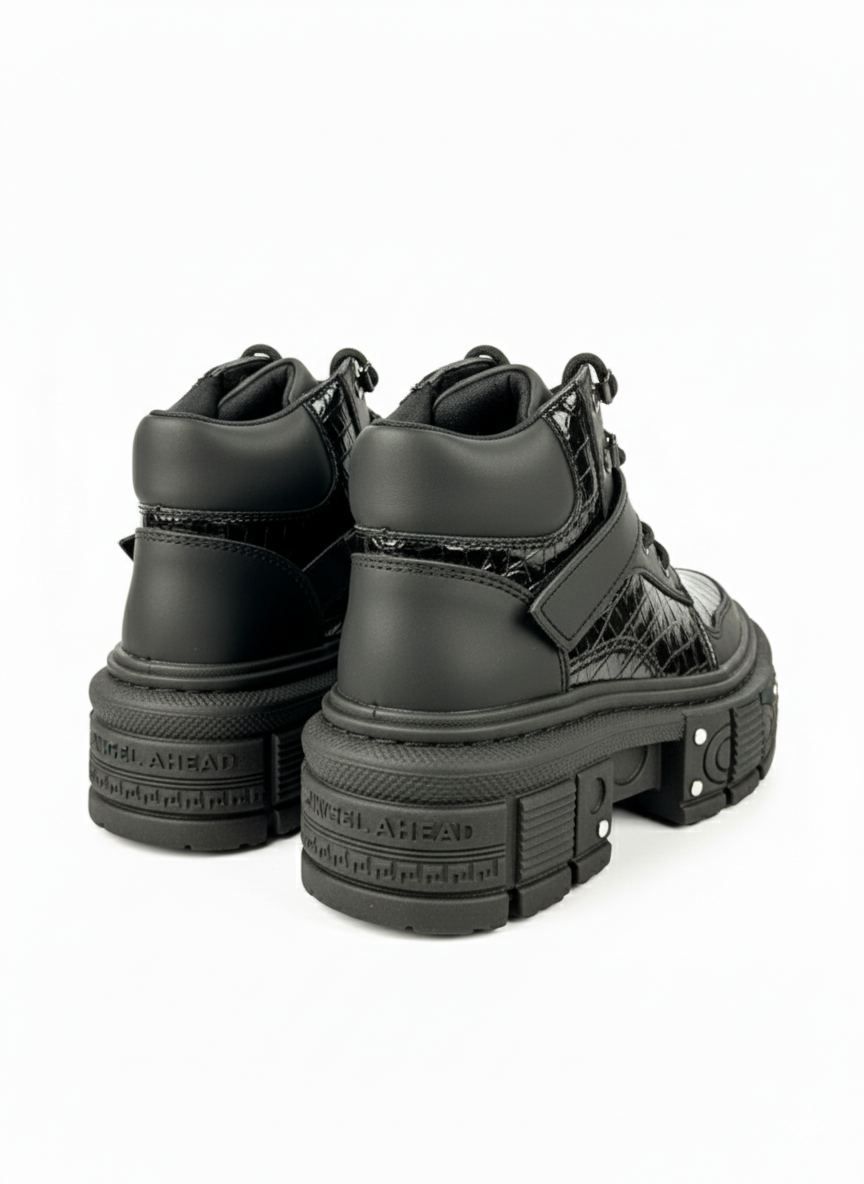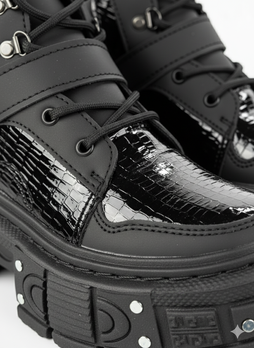 Shaker-52 es el botín Demonia por excelencia. Con una atrevida plataforma de cuña apilada de 11,4 cm que elevará cualquier atuendo de ordinario a extraordinario. El llamativo cuero vegano negro le da un toque vanguardista a tu look, mientras que la parte delantera con cordones y las correas de tobillo con doble hebilla brindan un ajuste seguro y cómodo.